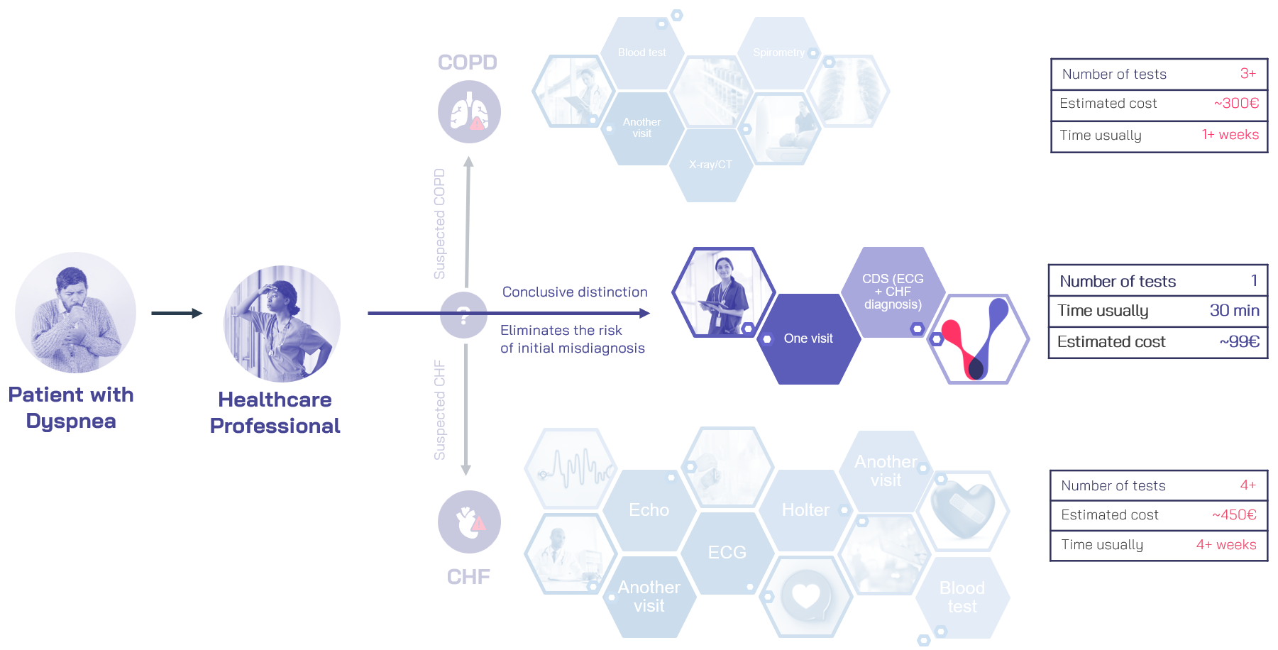 We have developed a device that records the following three signals from the human body: 3D ECG, 3D impedance and chest auscultation. These measurements are made using 7 electrode tips placed on the patient's body. Several minutes of signals coming from the chest are simultaneously recorded with a common time base. The recording is transmitted telemedically to the platform, where an algorithm compares each heartbeat with previous ones, analyzing their dynamic patterns. The result of this process makes it possible to immediately distinguish HF from COPD, and thus diagnose HF even for a primary care physician.