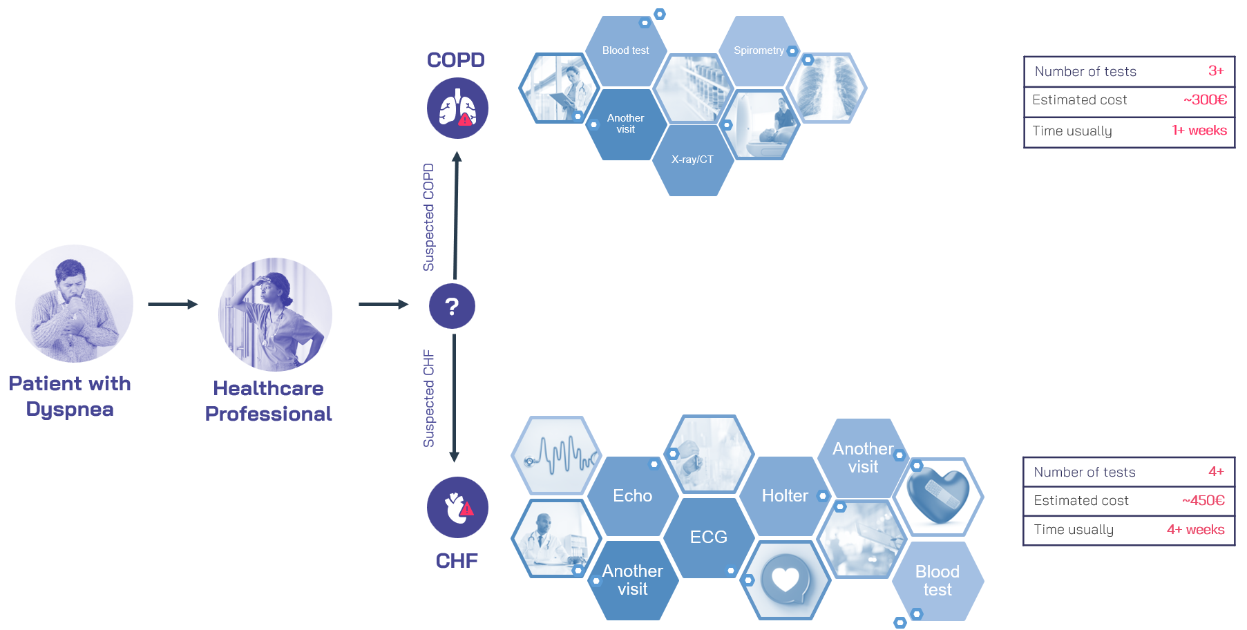 However still, it quite often gets primarily misdiagnosed. Depending on research, this applies to 16-68% of cases. Most often CHF is being Initially mistaken for Chronic Obstructive Pulmonary Disease (COPD), and even if identified determining its type (HFrEF or HFpEF) is also a difficulty.